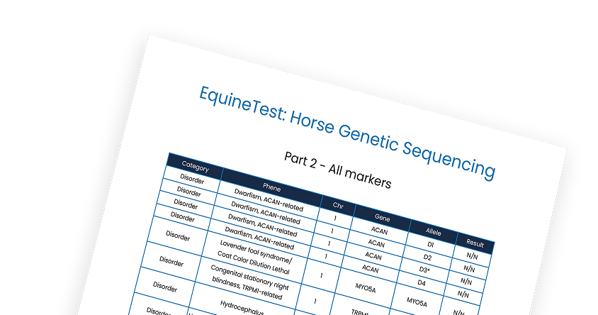 Start with a sample DNA report or order a whole genome DNA test for your horse.